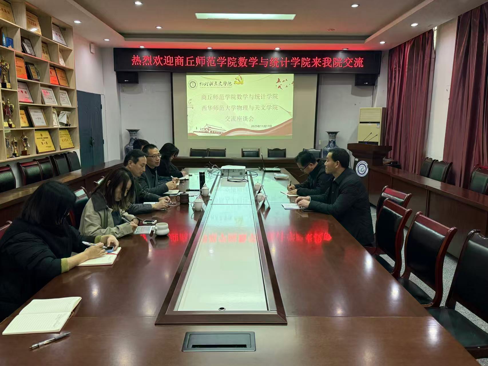 为深入推进样板支部建设,共同探索“党建+专业”融合路径,促进党建工作与学科建设协同发展,11月17日,数学与统计学院党委书记孟学超一行前往西华师范大学物理与天文学院开展党建交流。西华师范大学物理与天文学院党委书记陈金祥、副书记邓宗文等出席座谈会。