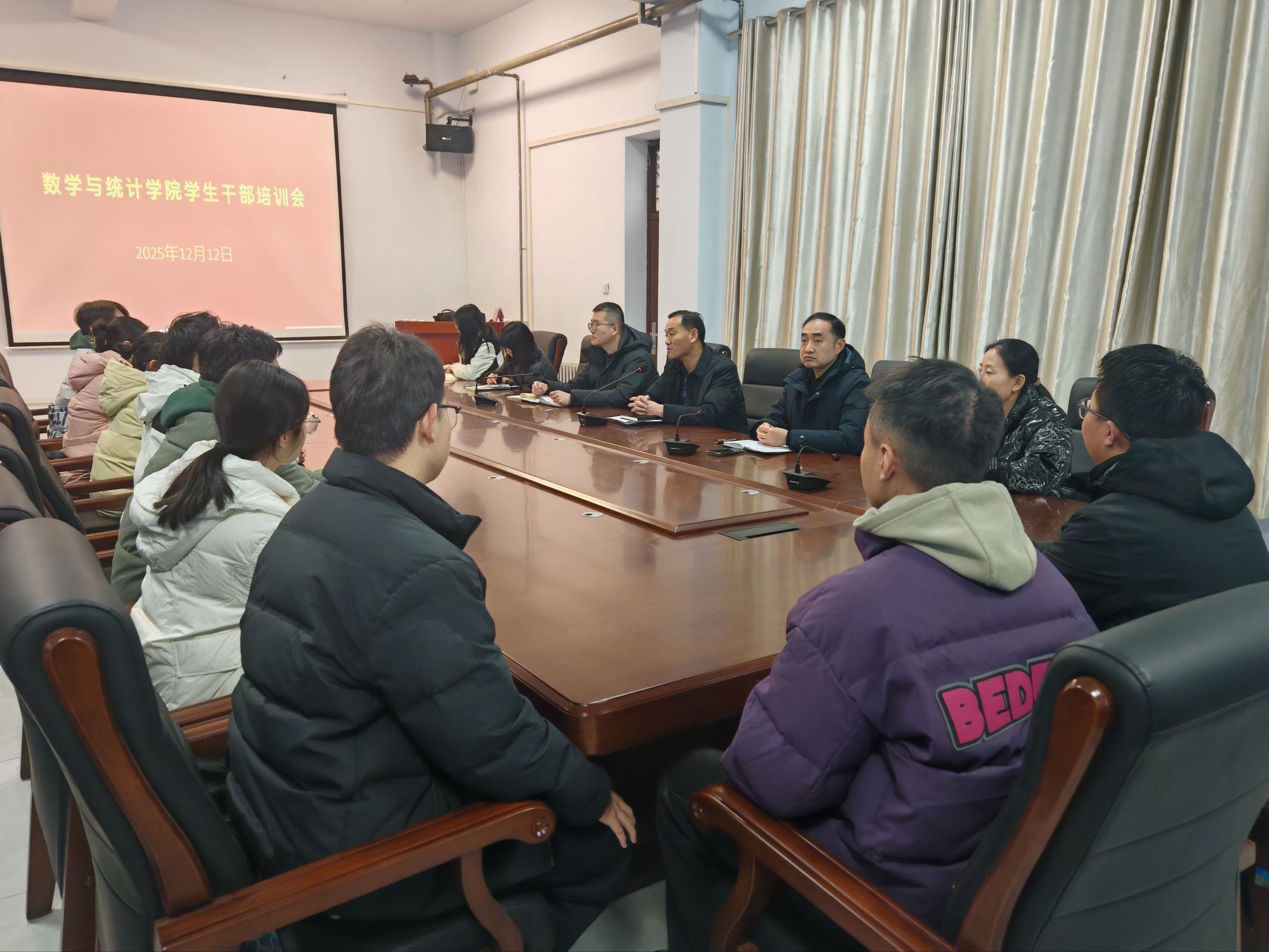 为提升学生干部综合素养,更好地发挥桥梁纽带作用,数学与统计学院于2025年12月12日举办学生干部培训会。学院党委书记孟学超、党委副书记郭广君、各年级辅导员与学生干部代表参加,会议由孟学超主持。