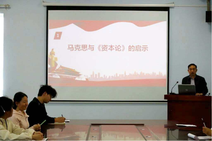 课上,郭广君首先以马克思与《资本论》为切入点,系统阐释马克思主义的真理力量,引导学生感悟科学理论的思想伟力,筑牢信仰根基。接着,他带领同学们回顾党的革命精神与百年奋斗历程,讲述共产党人坚守信念、攻坚克难的典型事迹,激励同学们传承红色基因、赓续精神血脉,永葆对党忠诚、为民奉献的政治本色;最后,结合新时代使命要求,明确当代青年生逢其时、重任在肩,要不断增强政治定力、明辨是非善恶,自觉将个人理想融入国家发展大局,在民族复兴征程中找准定位、担当作为。