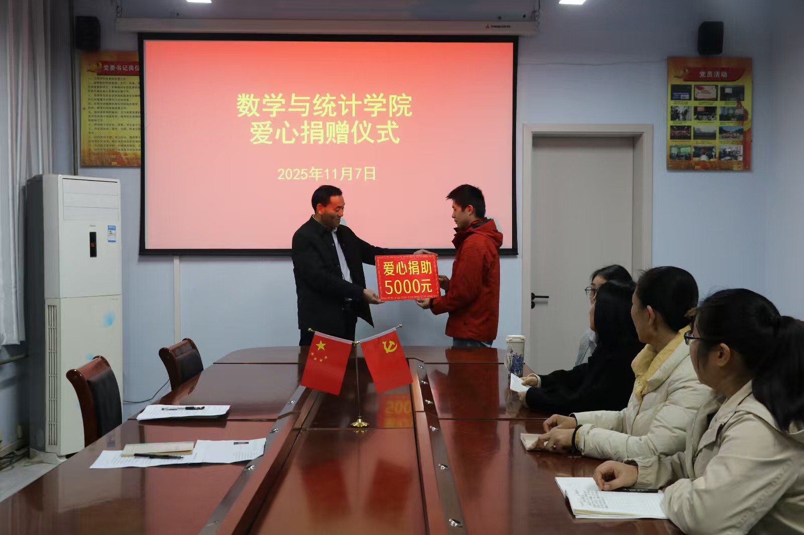 扎实推进资助育人工作,切实助力学生成长成才,11月7日下午,数学与统计学院于睢阳校区办公楼204会议室举行了“爱心捐赠”仪式。学院党委书记孟学超、学工办主任李昊阳、各年级辅导员、2025级数学2班班主任张清娟以及受助学生共同参加。