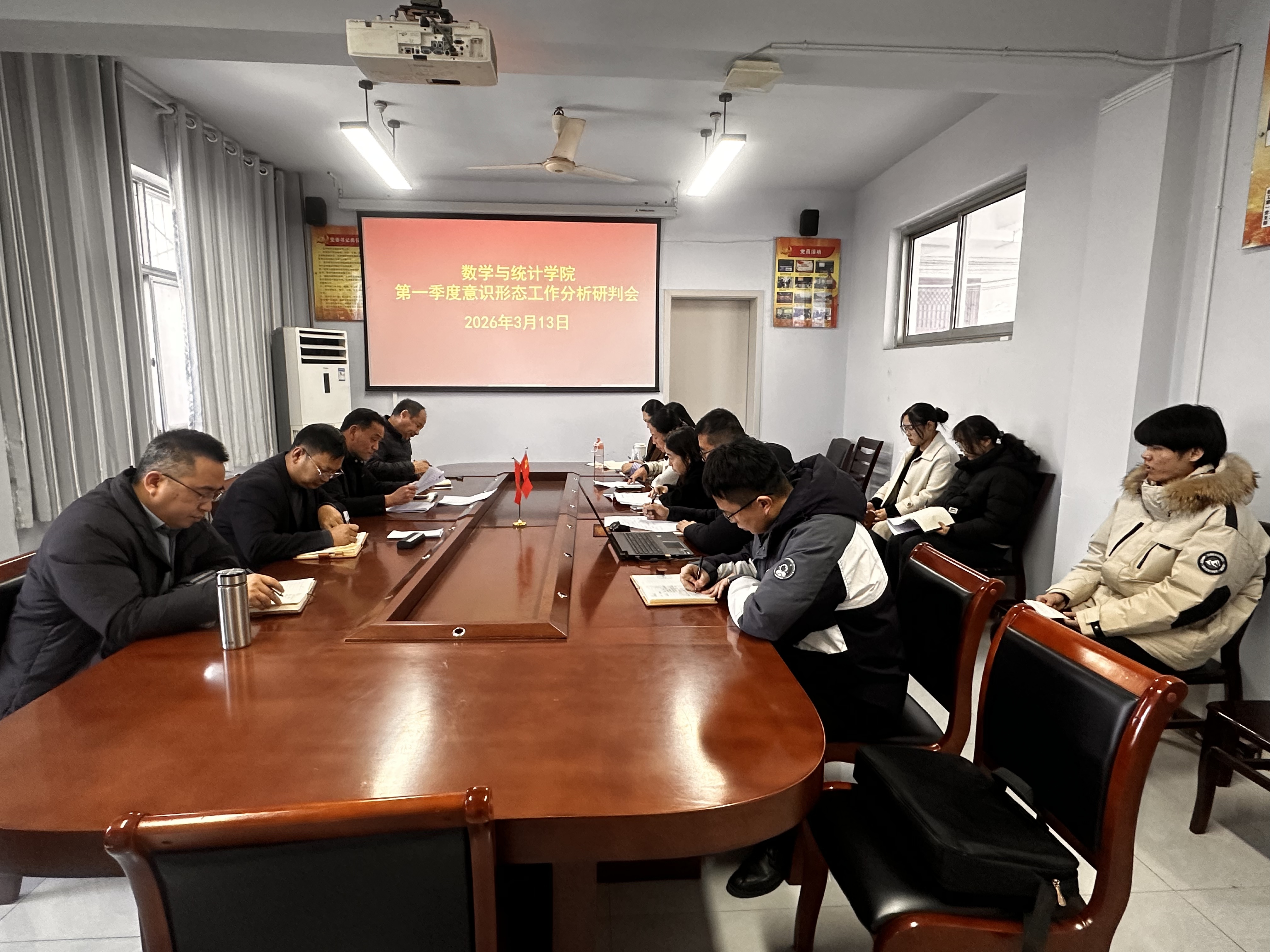 3月13日,数学与统计学院在数学楼204党建活动室召开2026年第一季度意识形态工作分析研判会。学院领导班子成员、全体辅导员及学生代表参加会议,会议由院党委书记孟学超主持。